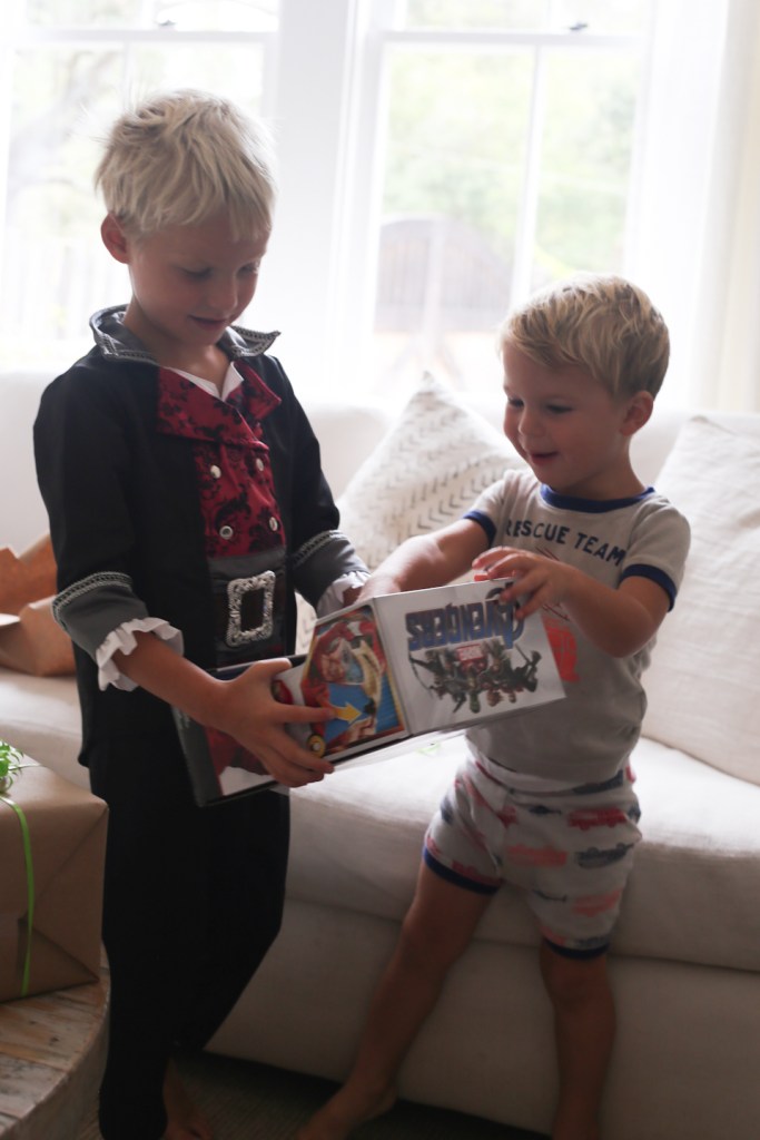 Abbie wanted to buy him something all herself and chose this dear little pirate outfit (that really just looks like a strange magician) but we got home and were wrapping it and I noticed 1-3 years… he still wore it through his whole party, being the sweet brother he is :):)